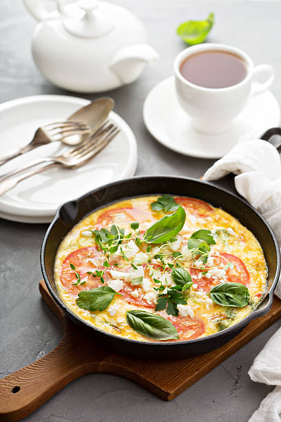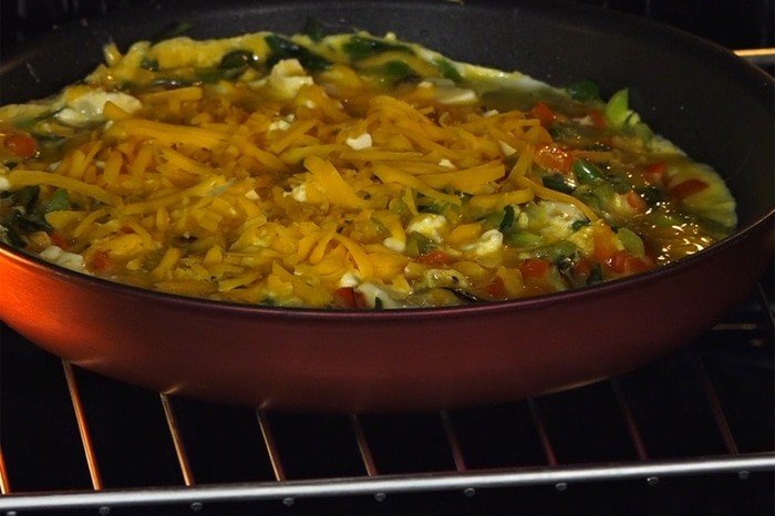 Šťavnatá, jemná fritatta je omeleta se zeleninou, žampiony nebo masem, velkoryse posypaná strouhaným sýrem a zapečená v troubě.
