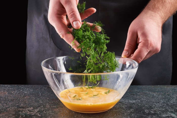 Kopr nasekáme najemno. Přidáme do vajec, promícháme.