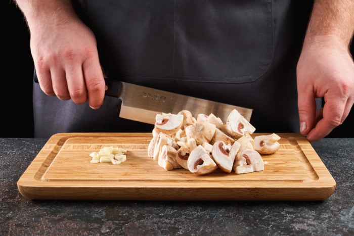 Houby omyjeme a osušíme papírovou utěrkou. Jemně nasekáme česnek, nasekáme houby.