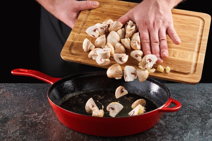 Na pánvi zahřejeme máslo a olivový olej, vložíme houby a česnek. Smažíme na velkém ohni po dobu 3 minut.