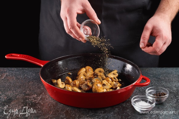 Přidáme oregano a dusíme další 3 minuty, smetšíma oheň. Osolíme, opepříme, a sundáme z ohně.