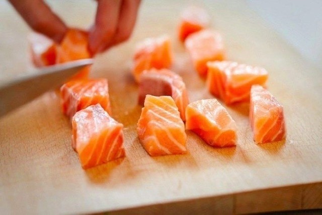 Lososa nakrájíme na větší kostky a lehce promícháme s česnekem utřeným se solí, zakapeme citronovou šťávou a necháme v hladu odležet hodinu.