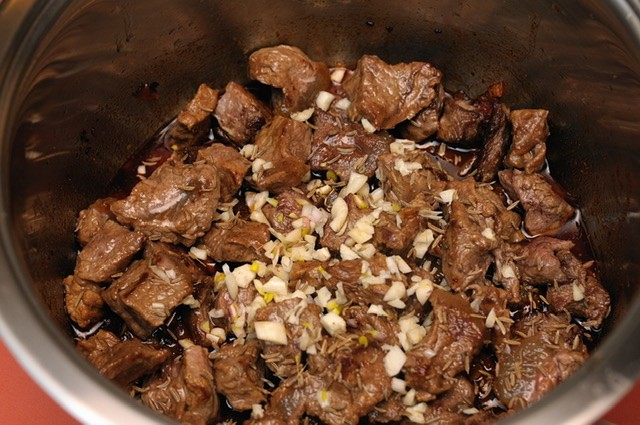 Cibuli nakrájíme najemno a orestujeme na 50 g vepřového sádla do zlatohněda. Maso nakrájíme na kostky, osolíme, opepříme, přidáme k cibuli a restujeme 10 minut.