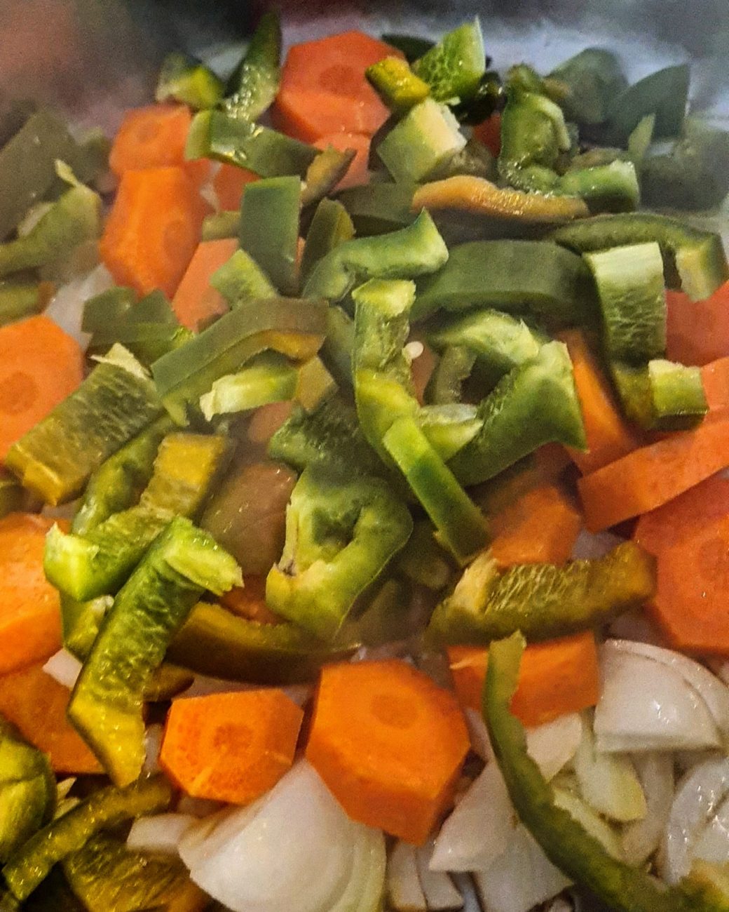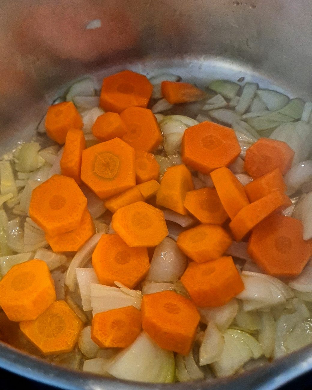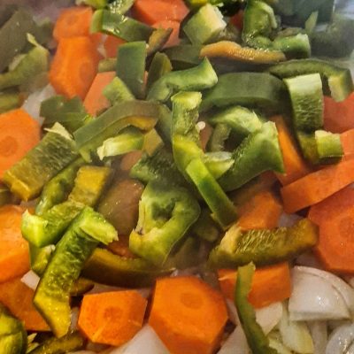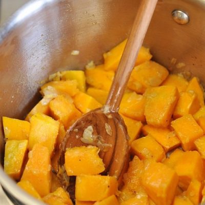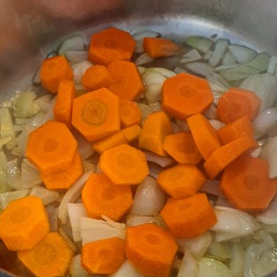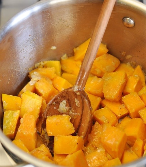 Oloupanou cibuli nakrájíme na kostičky a osmahneme dozlatova na oleji. Pote přidáme na kostičky nakrájenou zeleninu: mrkev, papriku, dýně a zalijeme vývarem.