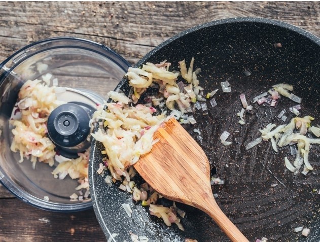 Na pánvi rozehřejeme 2 lžíce másla a osmahněme na něm šalotku 5 minut. Přidáme strouhané jablko a smažíme ještě dalších 3 minuty. A přeložíme vše do kuchyňského robotu.