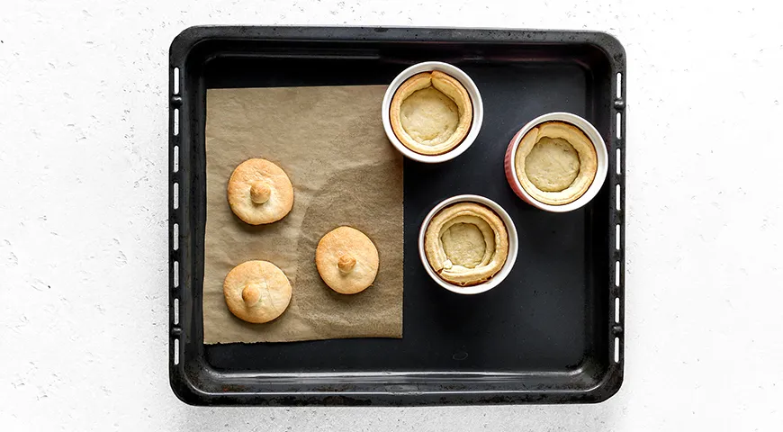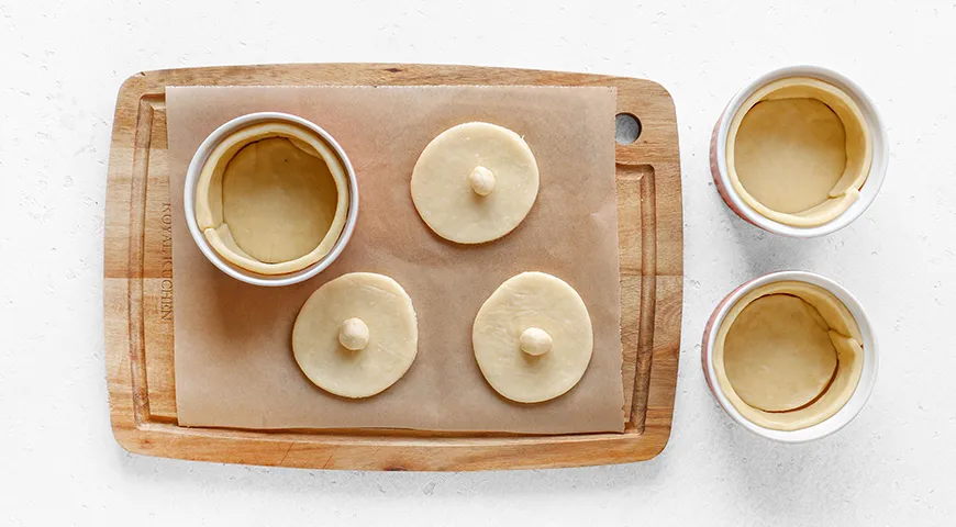 Těsto rozdělte na dvě nerovné části – jednu třetinu a dvě třetiny. Každou část rozválejte na tenké pláty. Z větší části těsta vykrájejte kolečka o průměru rovném průměru formiček plus dvojnásobek výšky stran; tato kolečka budou základem pro hrníčky. Rovnoměrně rozprostřete těsto do formiček. Ze zbylé části těsta vykrájejte víčka odpovídající průměru formiček a na nich vytvořte úchytky ve formě malých kuliček. |