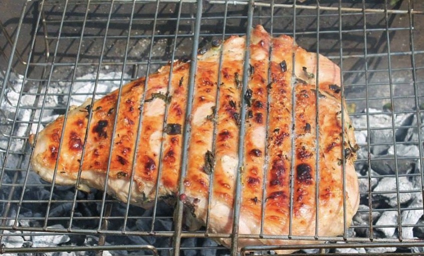 Kachní prsa omyjeme, osušíme a po krajích nařízneme kůži. Maso osolíme, okmínujeme a ze strany, kde není kůže, potřeme olejem.