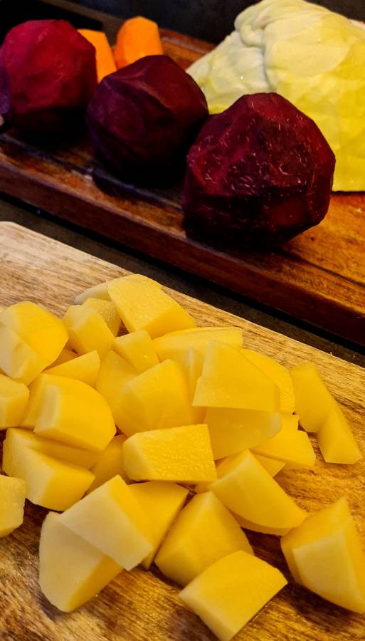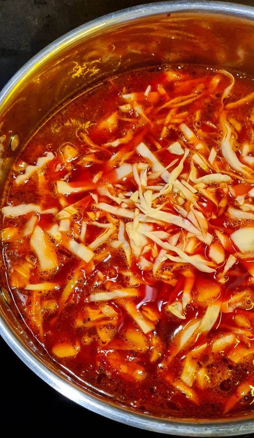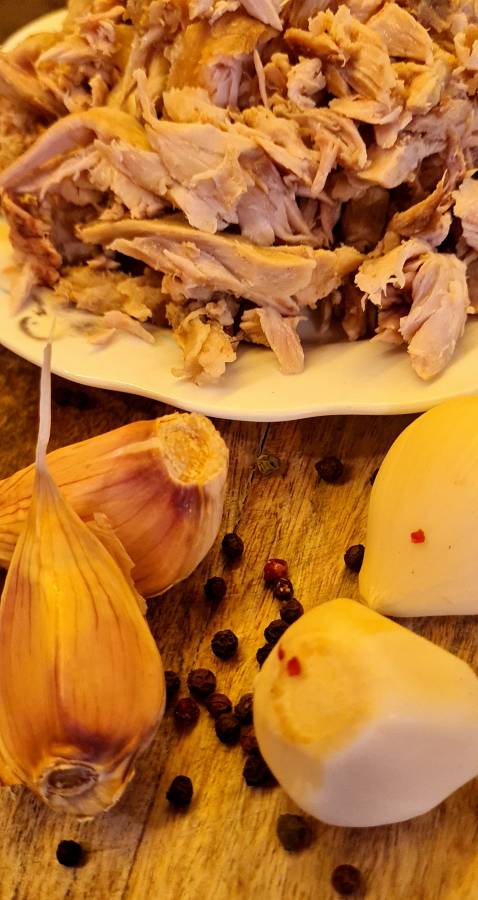 Vepřové žebra umyjeme ve studené vodě, vložíme do hrnce, zalijeme1,5 litru studené vody a dáme na 45minut vařit. Pokud se na vývaru vytvoří pěna, sesbíráme ji naběračkou. Osolíme a vaříme maso skoro doměkka na mírném ohni, doba varu záleží na tom, jaký druh masa použijete. Koncem vaření vývaru přidáme celý pepř, nové koření a bobkový list. Vyjmeme maso, vývar přecedíme a maso rozebereme rukama na vlákna.