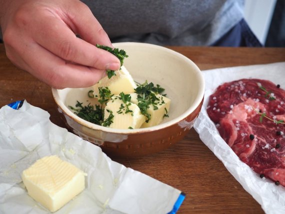 Pořádný steak připravený na grilu s bylinkovým máslem