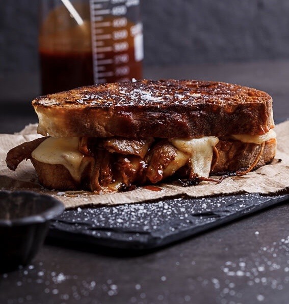 Chleba potřeme máslem a opečeme jej na grilu s obou stran. Na gril dáme také plátky šunky a slaninu.