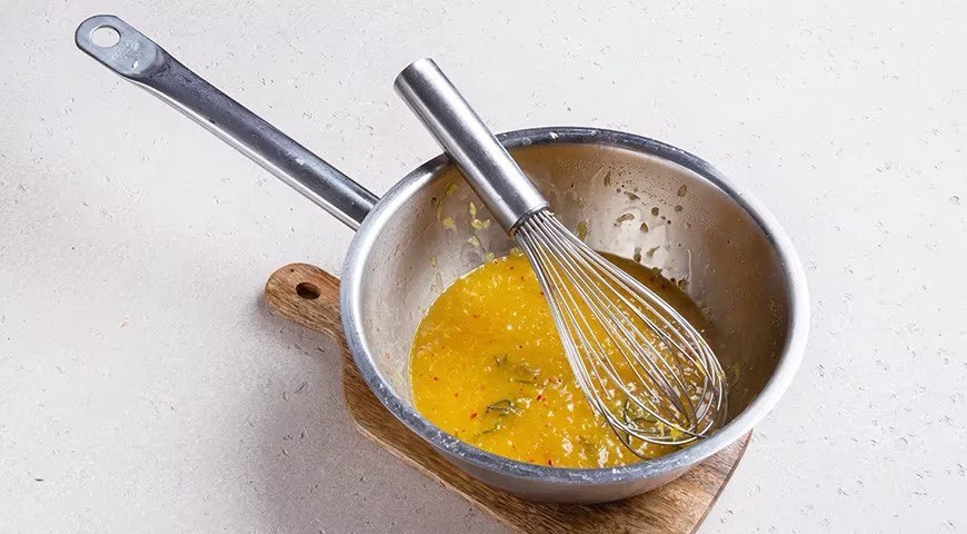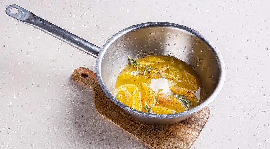 Pomerančova omáčka:Zatímco se ryba peče, připravte pomerančovou omáčku k podávání. Z druhého pomeranče odřízněte kůru. Ostrým nožem vyřízněte šťávu, rozpusťte máslo v pánvi a vložte připravené plátky pomeranče. Přidejte cukr a malou větvičku rozmarýnu. Směs opečte na středním ohni, neustále míchejte a lžící rozmačkejte plátky, 3-4 minuty. |