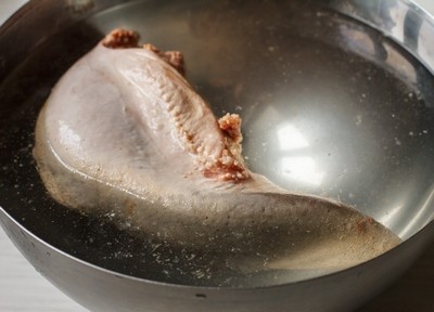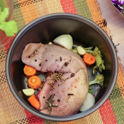 Ve vině namočíme švestky nakrájené na nudličky a rozinky. Umytý jazyk vložíme do studené čisté vody, vaříme 20 minut.