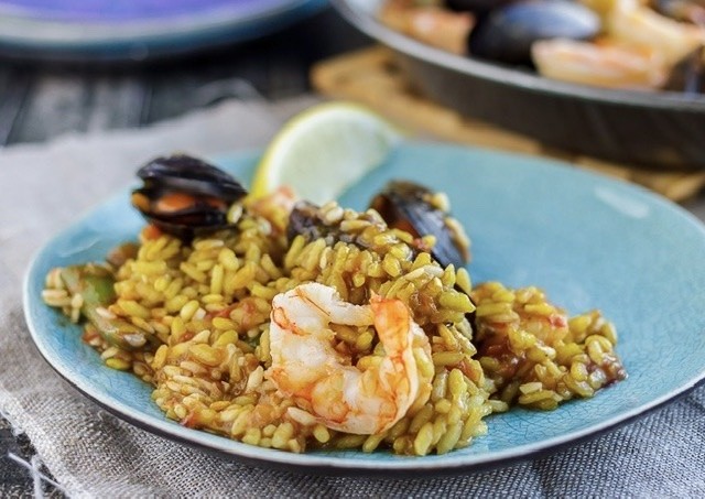Do pánve přidáme nakrájené rajčata, posekaný česnek. Všechno osolíme, přidáme kurkumu, špetku šafránu a propláchnutou rýží. Pořádně promícháme, zalijeme vývarem a pod pokličkou dusíme 10 minut. |