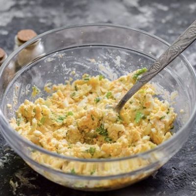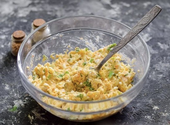 Žampiony a vajíčka uvařená natvrdo dobře posekáme, osmažíme nadrobno pokrájenou cibuli. Pote spojíme suroviny, přidáme vajíčka, kopr, sůl, pepř a spracujeme homogenní hmotu.