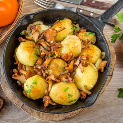 Po změknutí žampionů ( po 10 minutách smažení ) je zalijeme vývarem a na mírném ohni vaříme asi 3 minuty. |