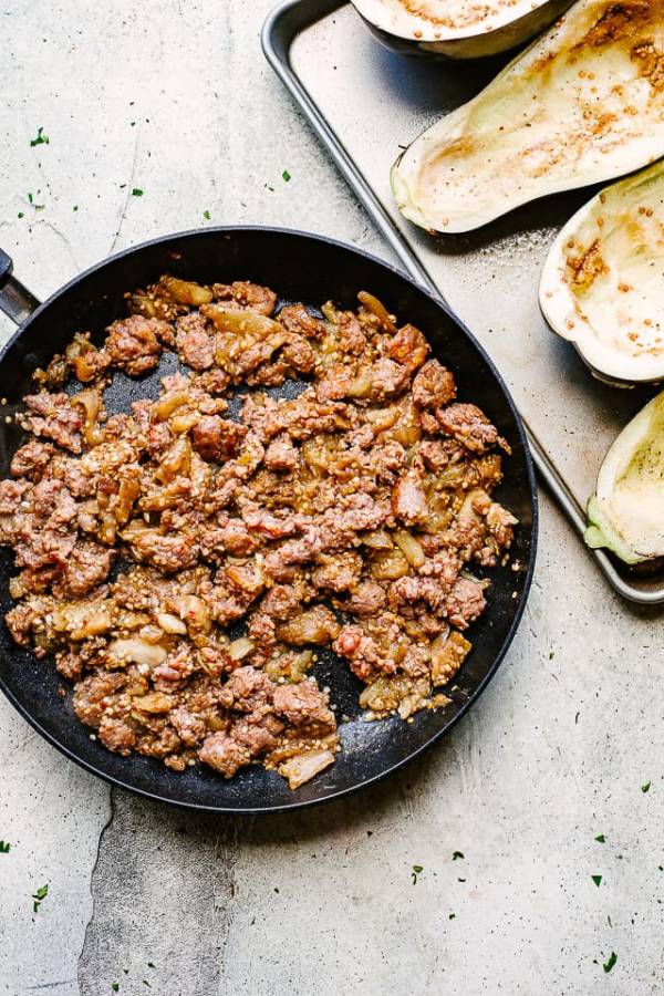 V mise spojíme všechny suroviny: mleté maso, kořeni, nasekanou petržel, cibulku, sůl, pokrájenou dužinu a všechno důkladně promícháme.