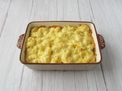 V nádobě vymazané tukem rozložíme dobře odkapaný květák, zalijeme omáčkou, posypeme syrém, strouhankou a nastrouhaným máslem a vložíme do trouby vyhřáté na 200 °C na 15 minut. Podáváme horký na vyhřátých talířích.